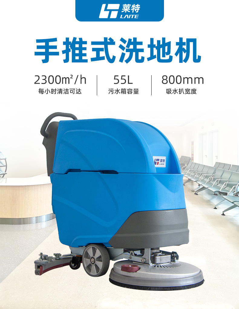 莱特LT-M2型手推式工业洗地机,工作效率2300㎡/h,清洗宽度530mm,吸水宽度800mm,电池容量24V/100Ah,采用大功率品牌电机,广泛用于工厂、车间、医院、商场、机场、地下车库等场景,洗刷吸三合一,去污不留痕,充满电可以连续工作2-3小时,适用于6000㎡左右的工作场地。